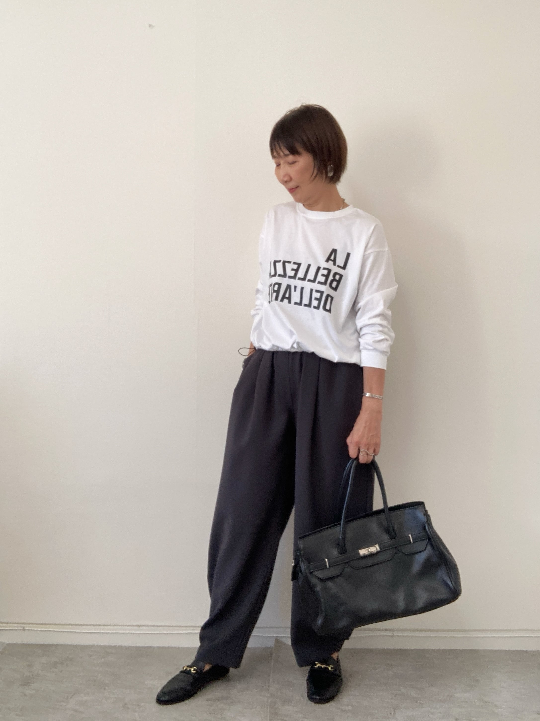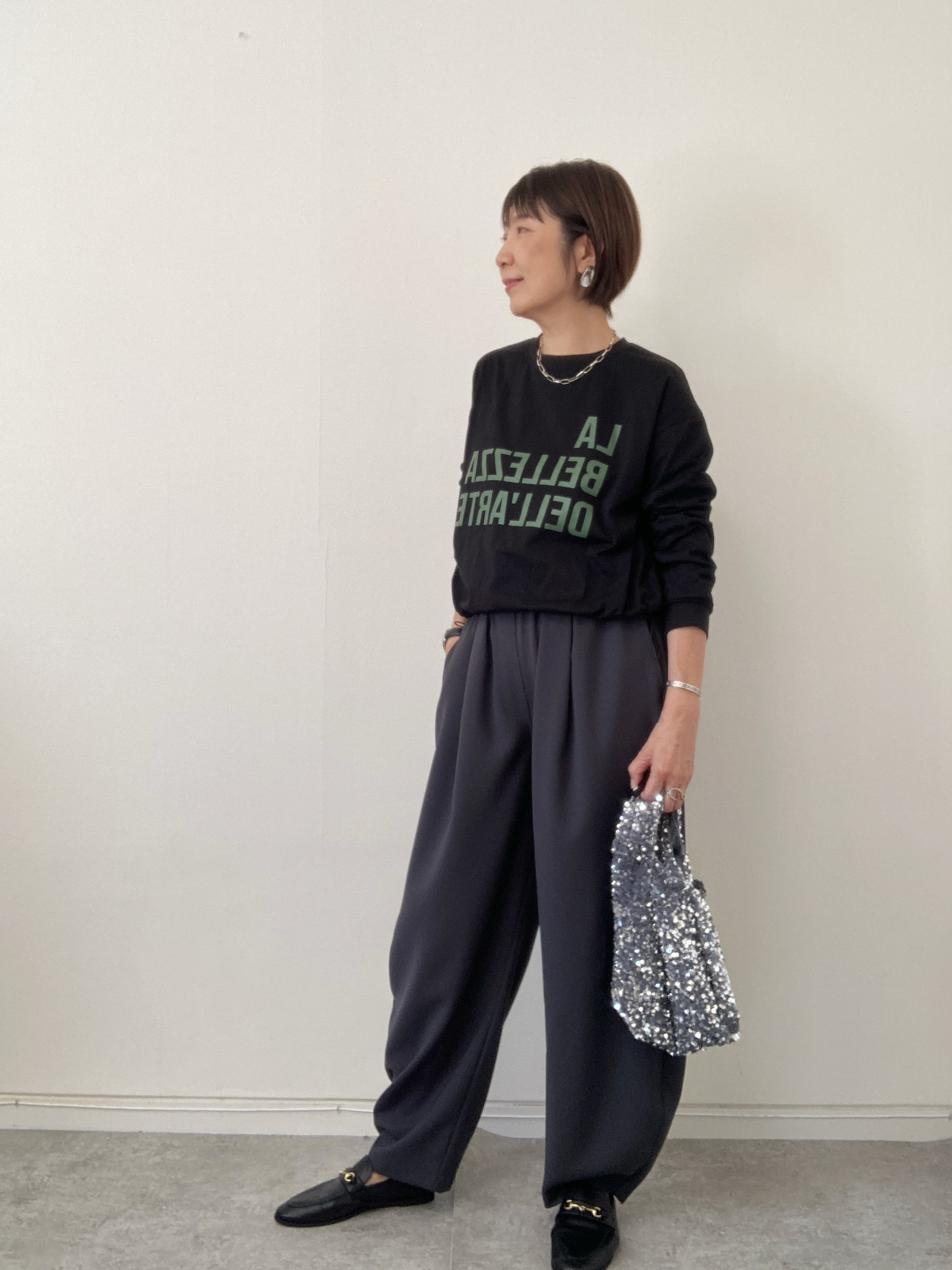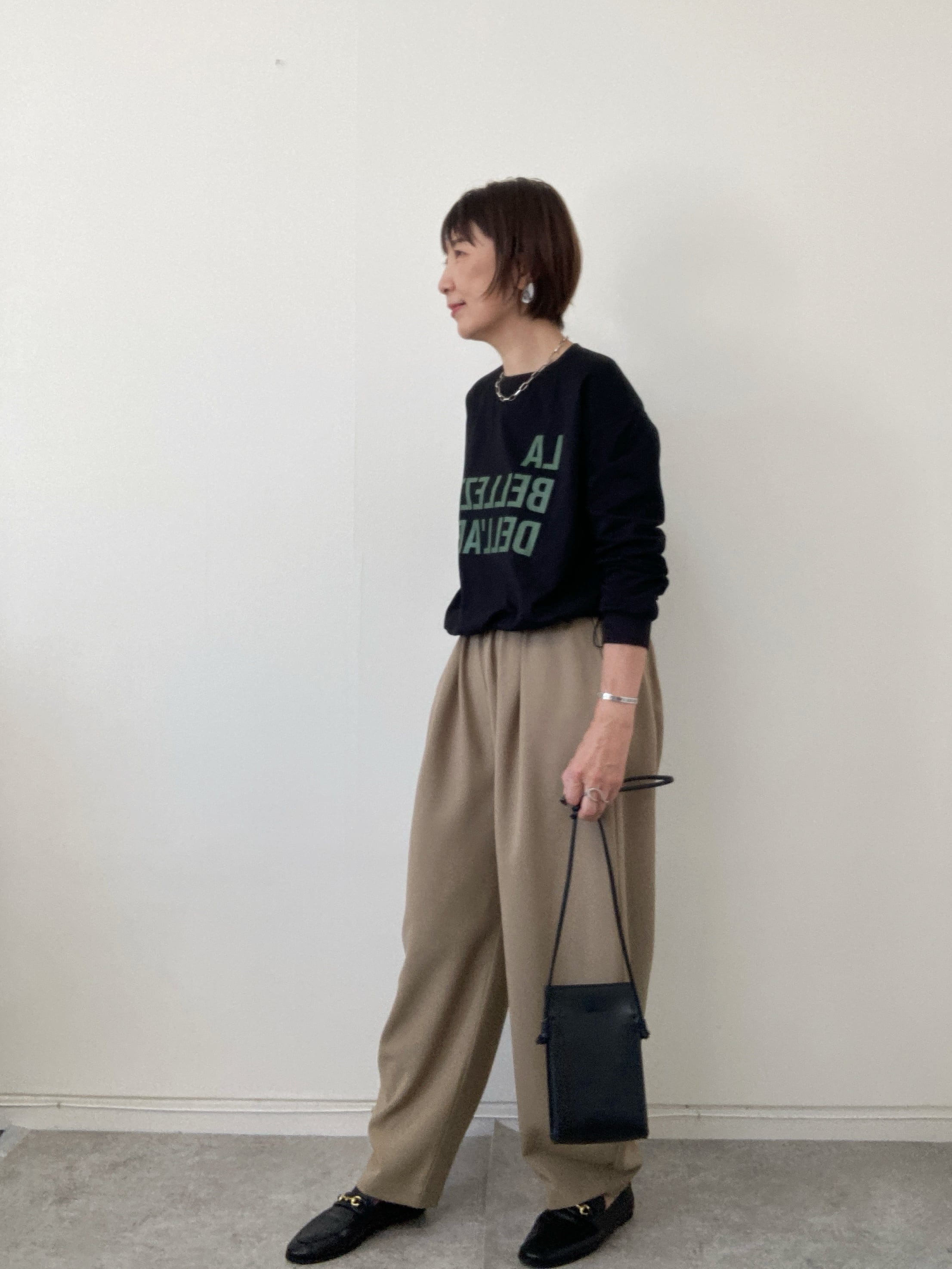 丈が短めのトップスなので、ワイドパンツやカーブシルエットパンツなど、ボリューム感のあるボトムと合わせやすいです!