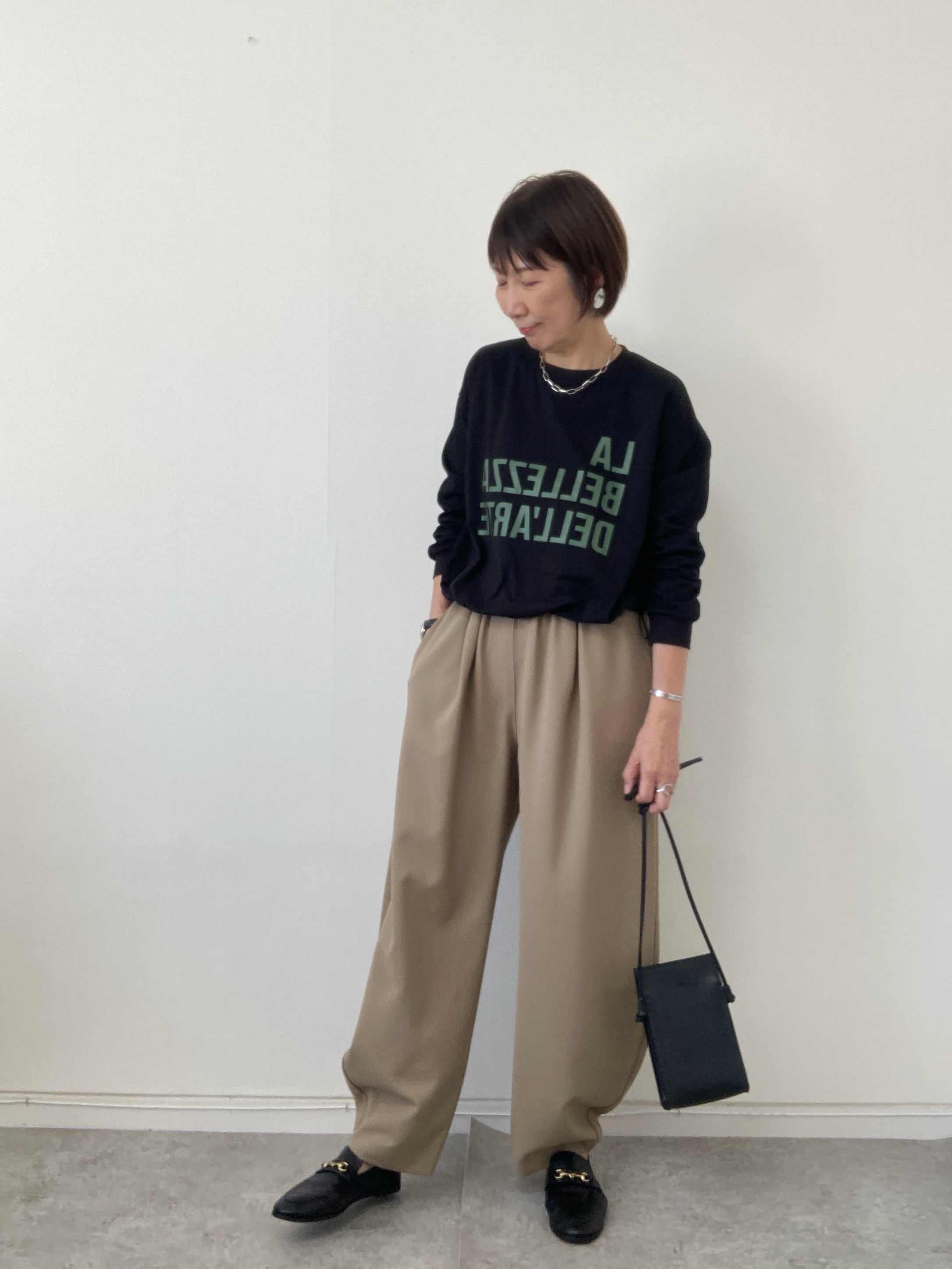 裾幅がやや細めになっているので、靴の甲の上に生地が溜まった感じで着こなす感じがポイントです!