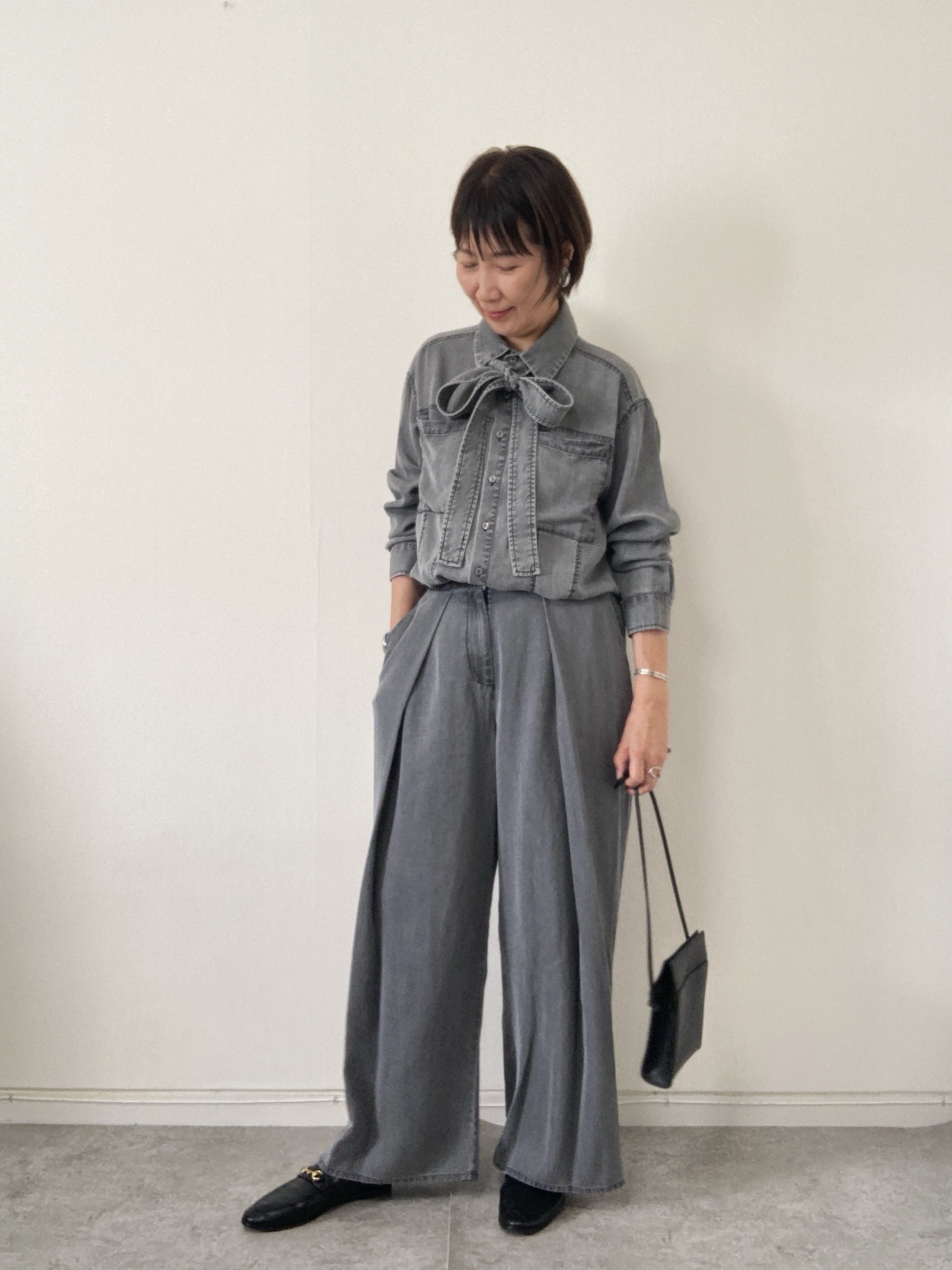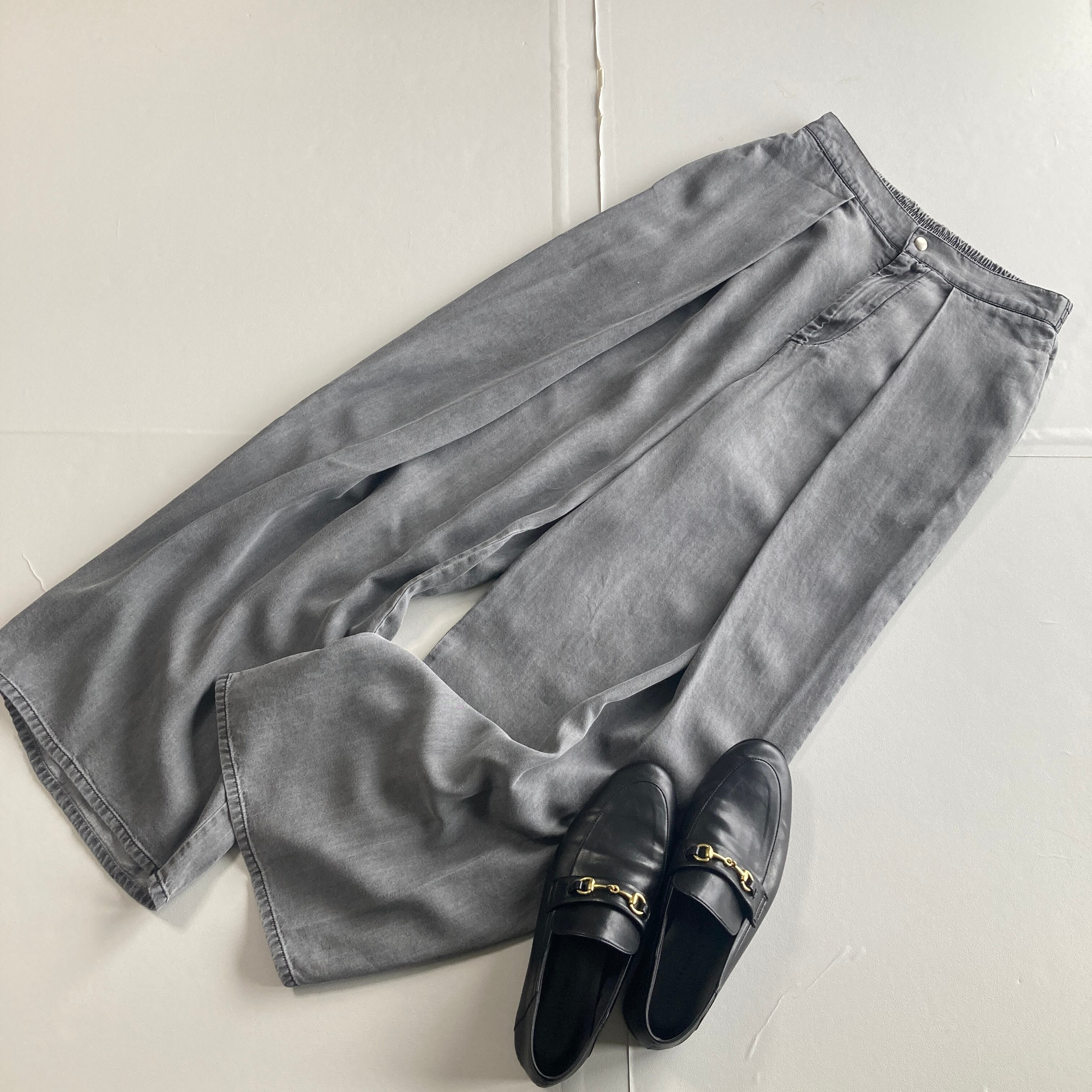 テンセルの落ち感とセンターラインのタックが、縦のラインを強調して脚長効果が期待できるデザインです。