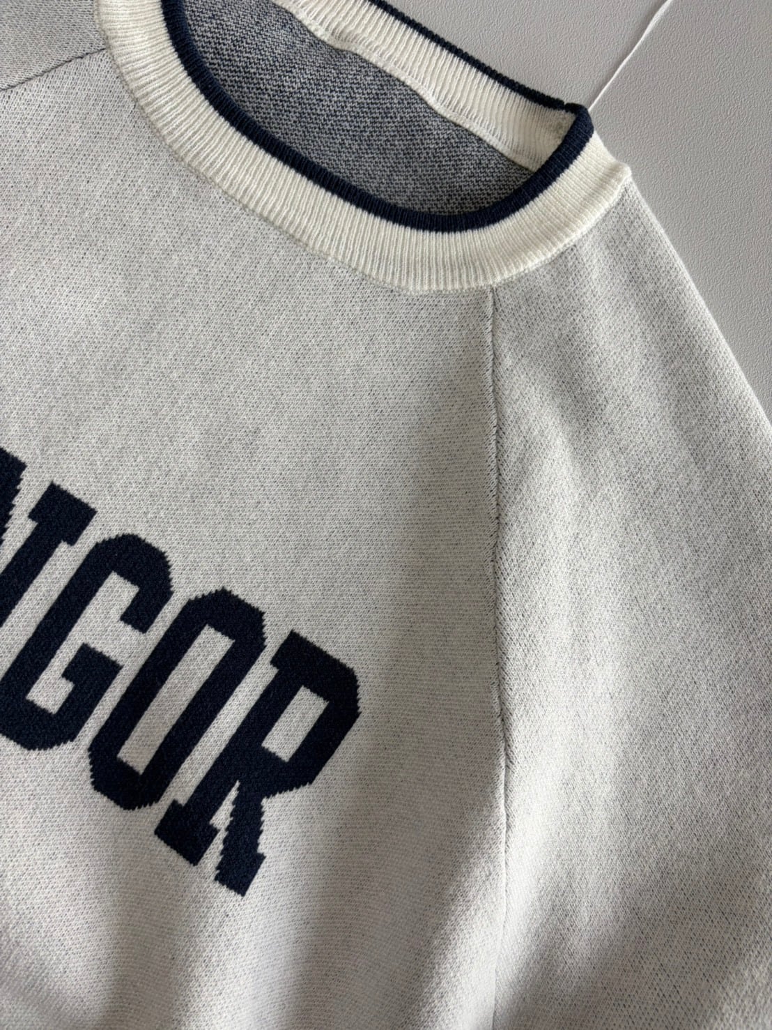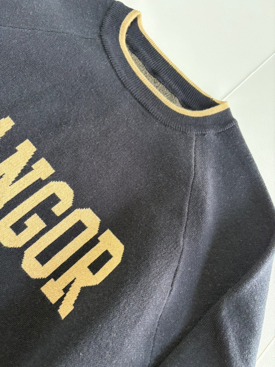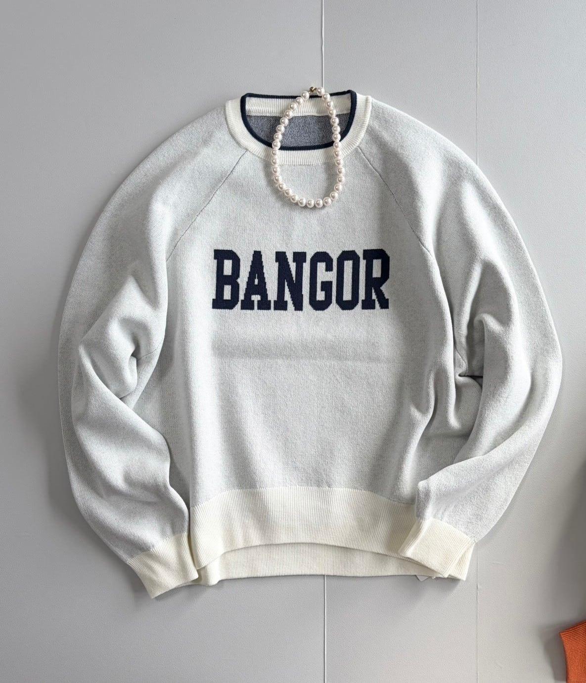 存在感のある「BANGOR」ロゴが目を引く、ジャガード編みのニットプルオーバー。