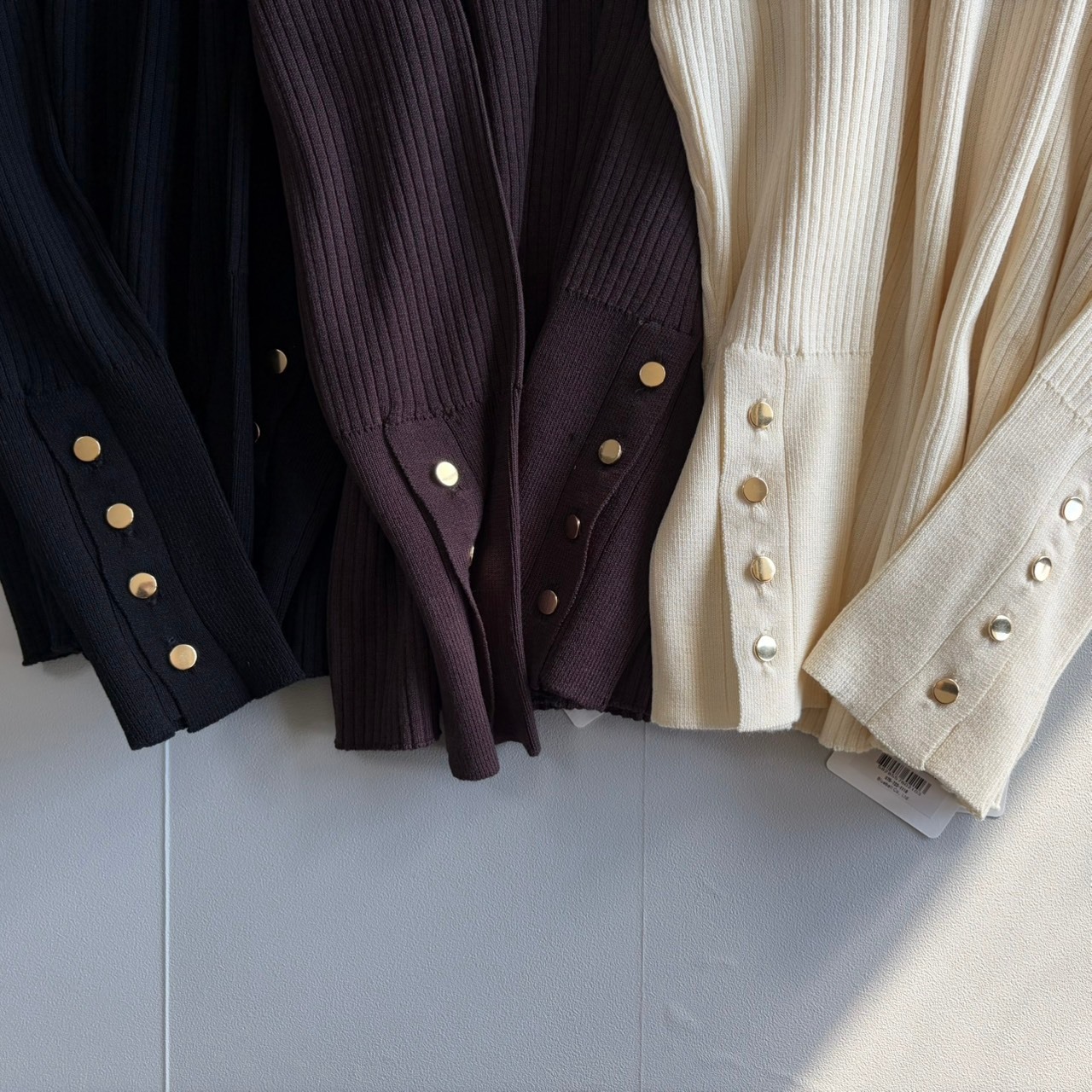 袖口のゴールドボタンが控えめなアクセントになり、大人コーデにさりげない華やかさを添えます。