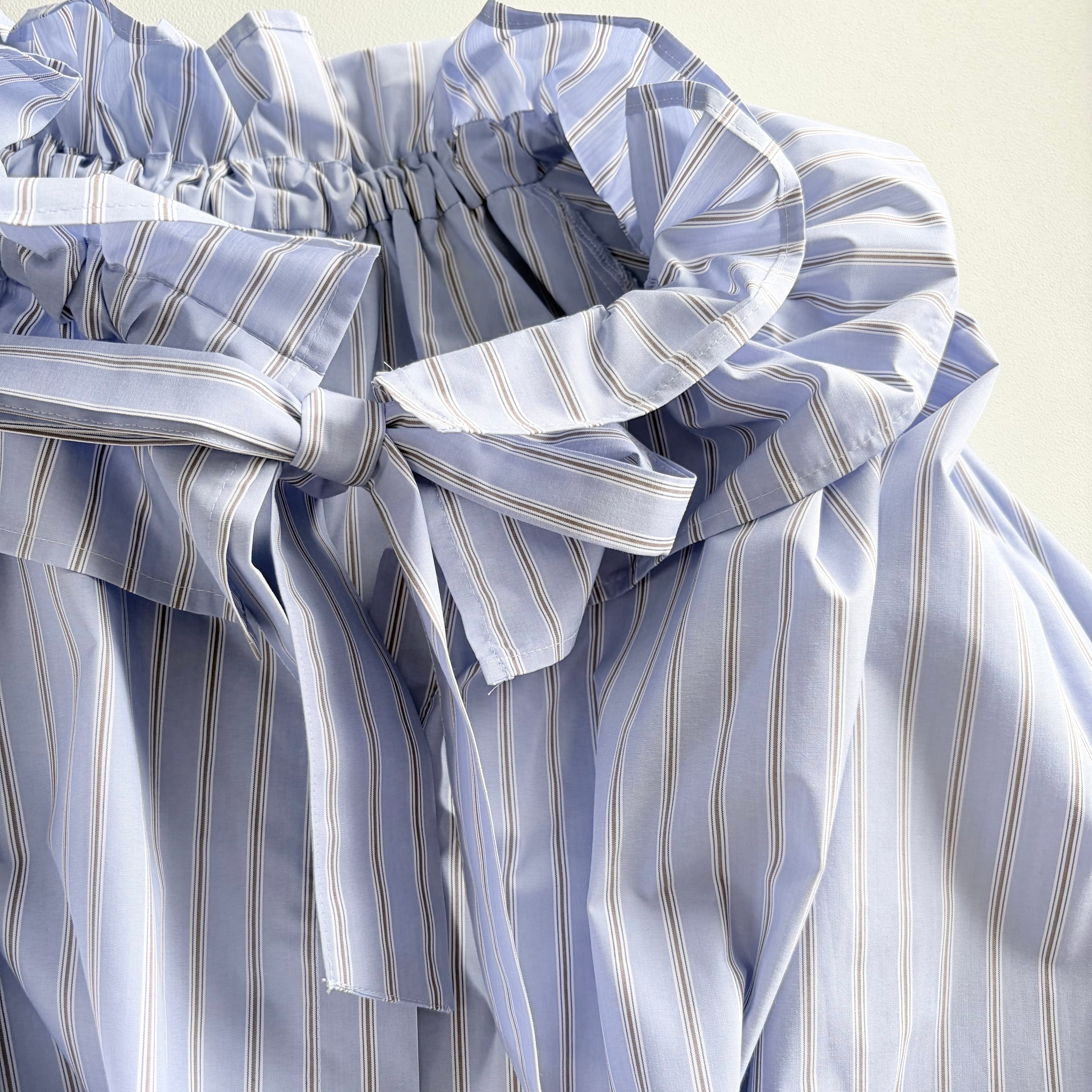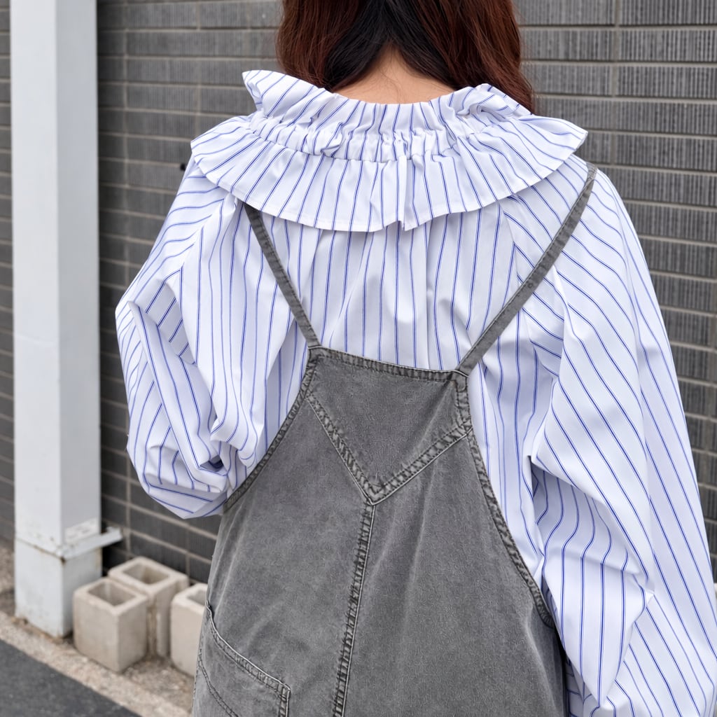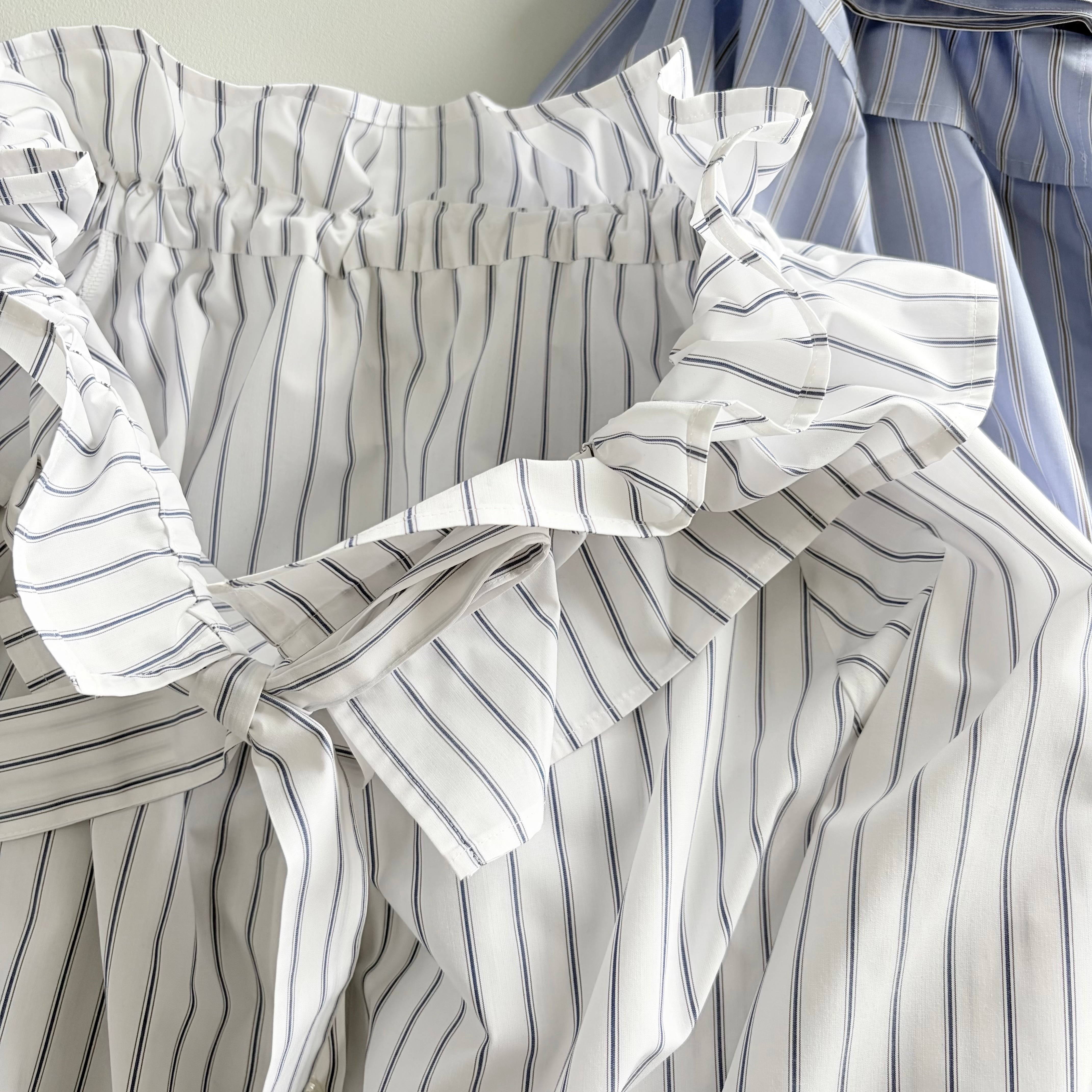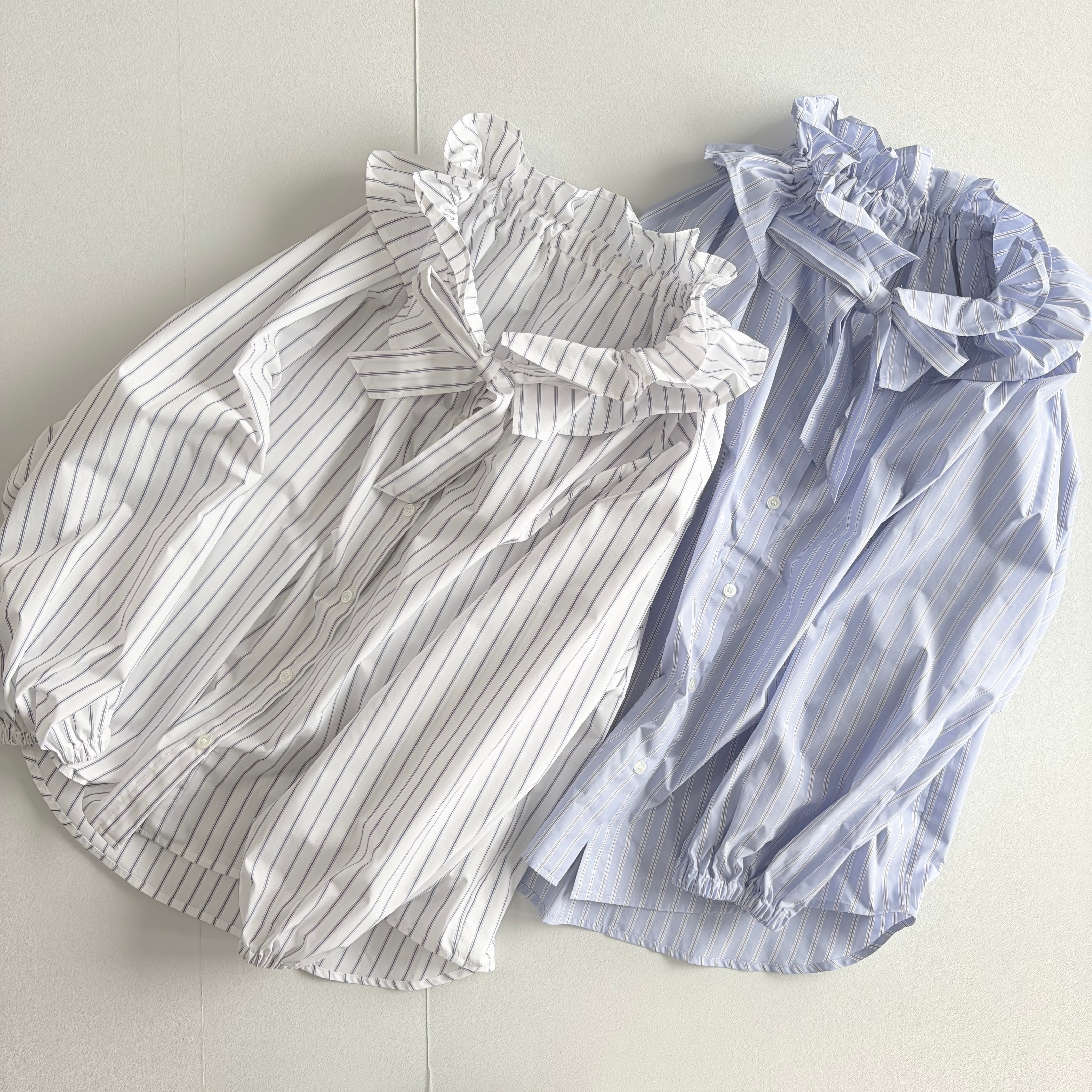 独特なストライプデザインとフリル襟が魅力の一着で、さまざまなスタイルにマッチします。カジュアルなデニムから、きちんと感のあるスカートまで幅広く対応し、着こなしの幅を広げてくれるアイテムです。