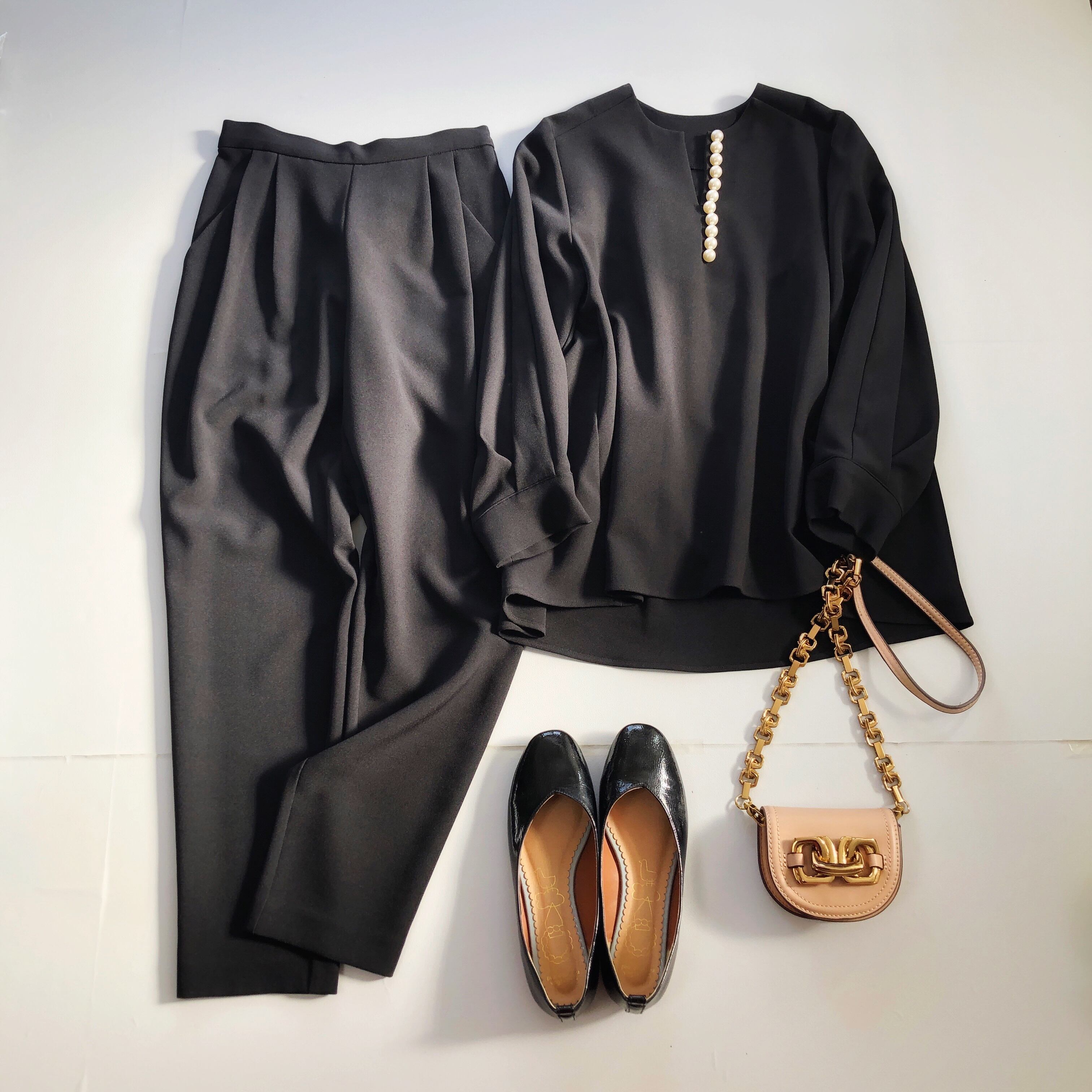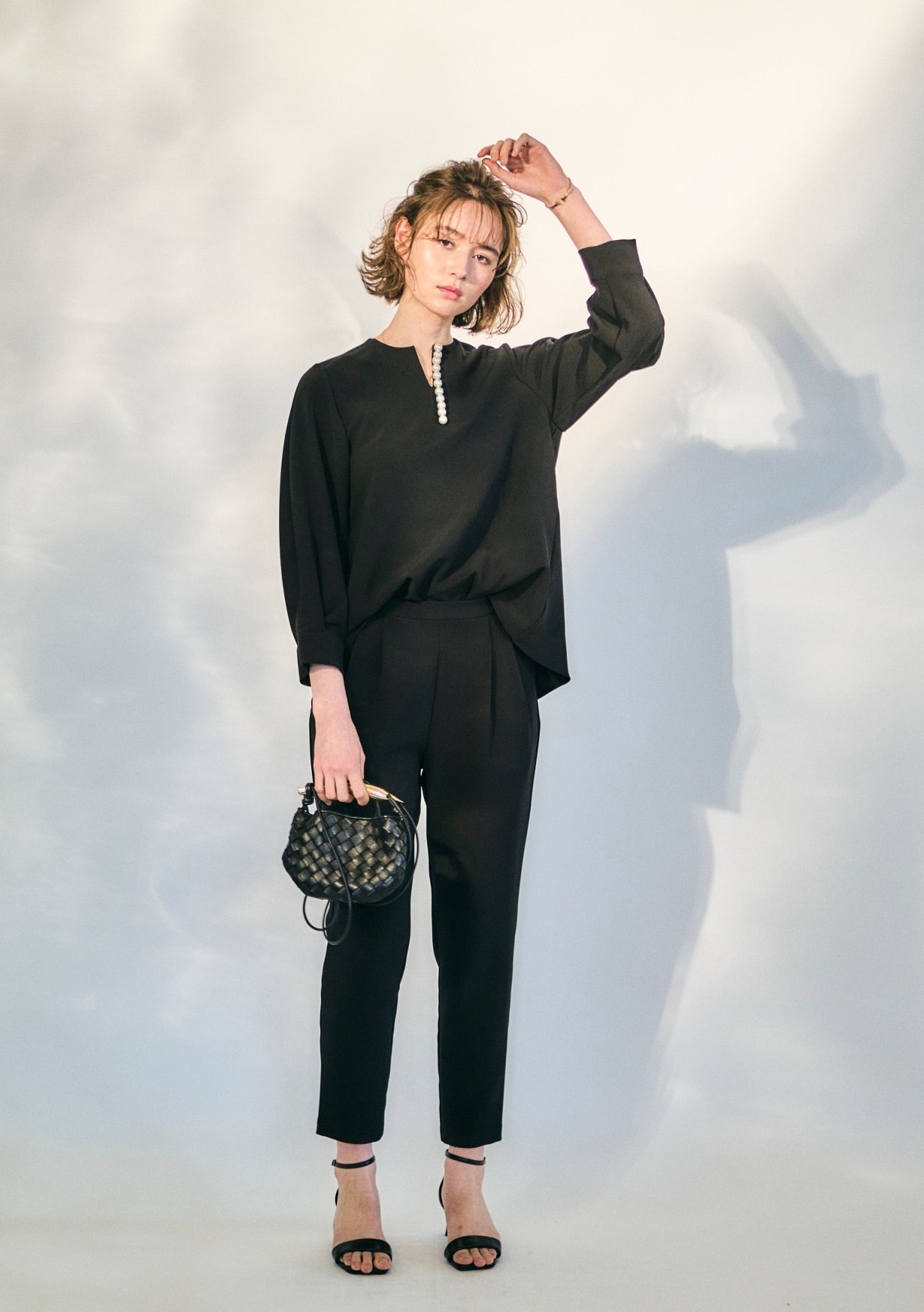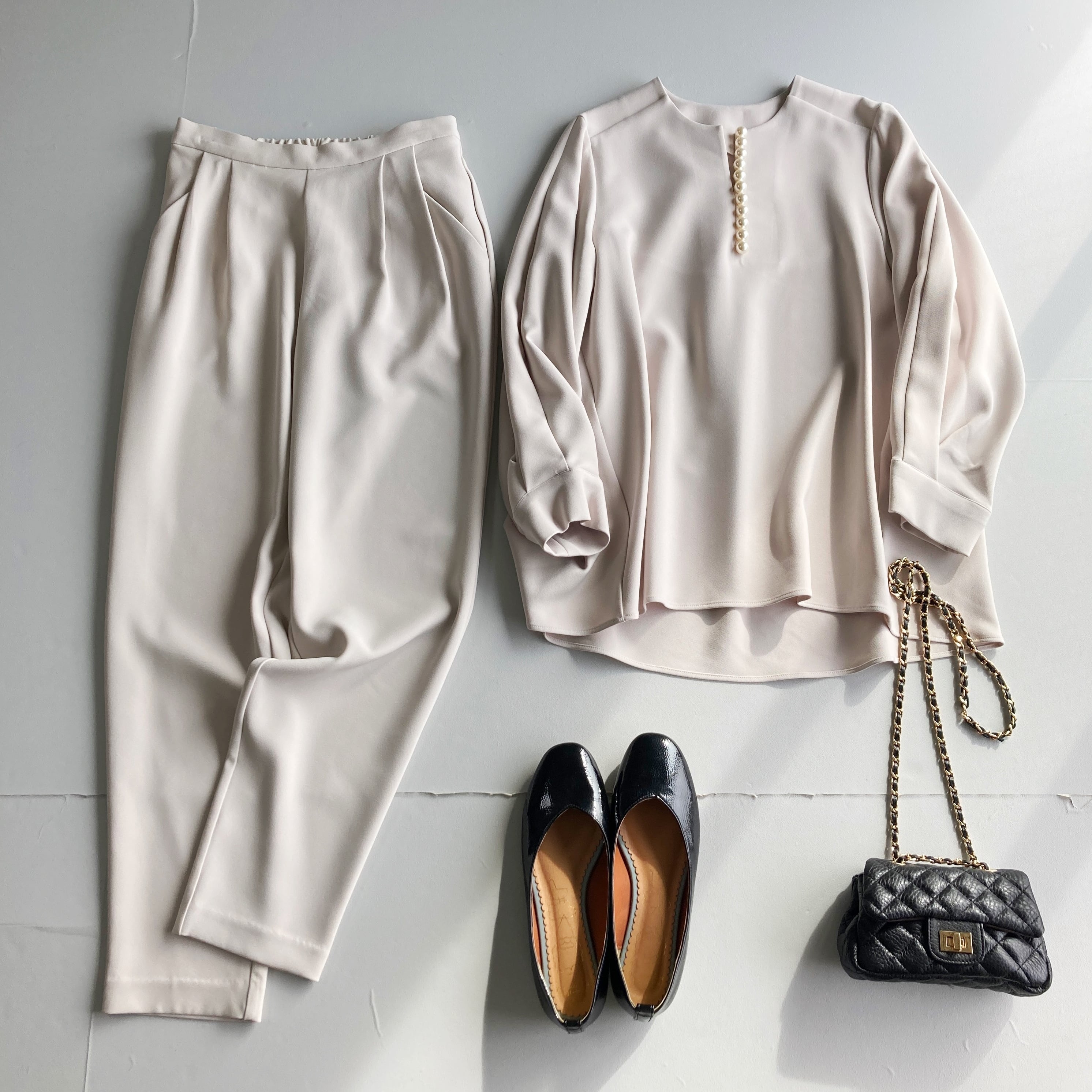 ♫大人気!パール付きキーネックブラウスのお揃いパンツに新色グレーが仲間入りしました。