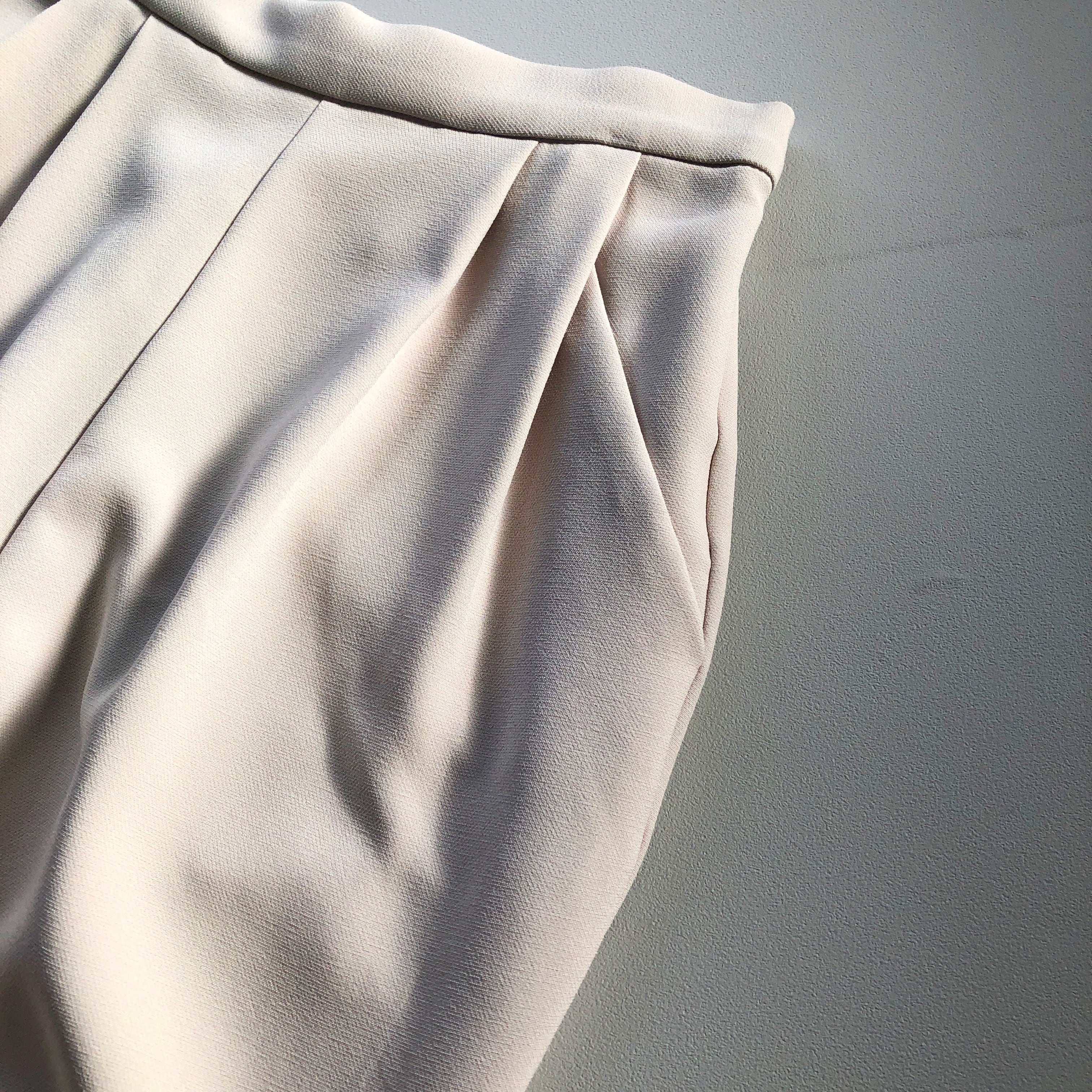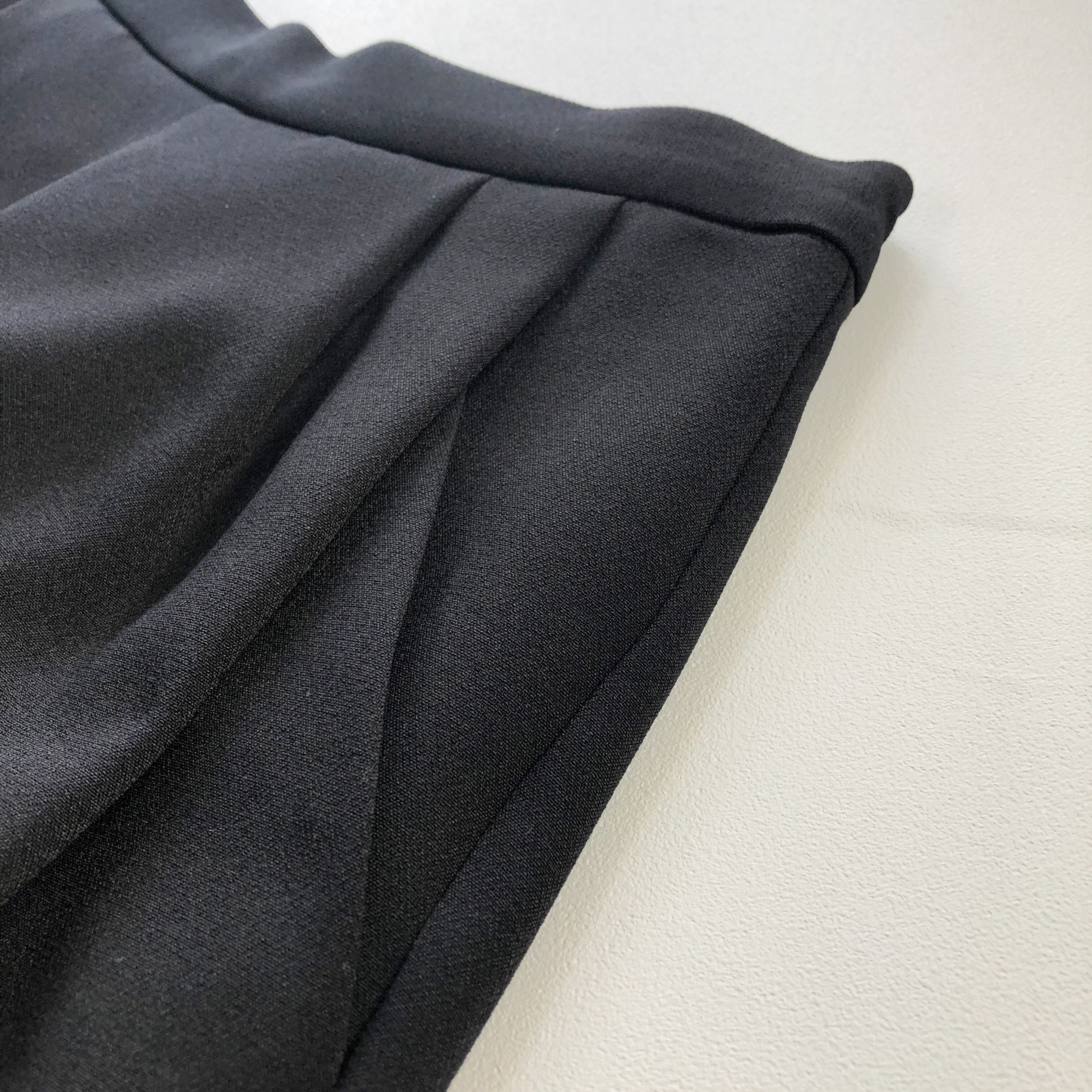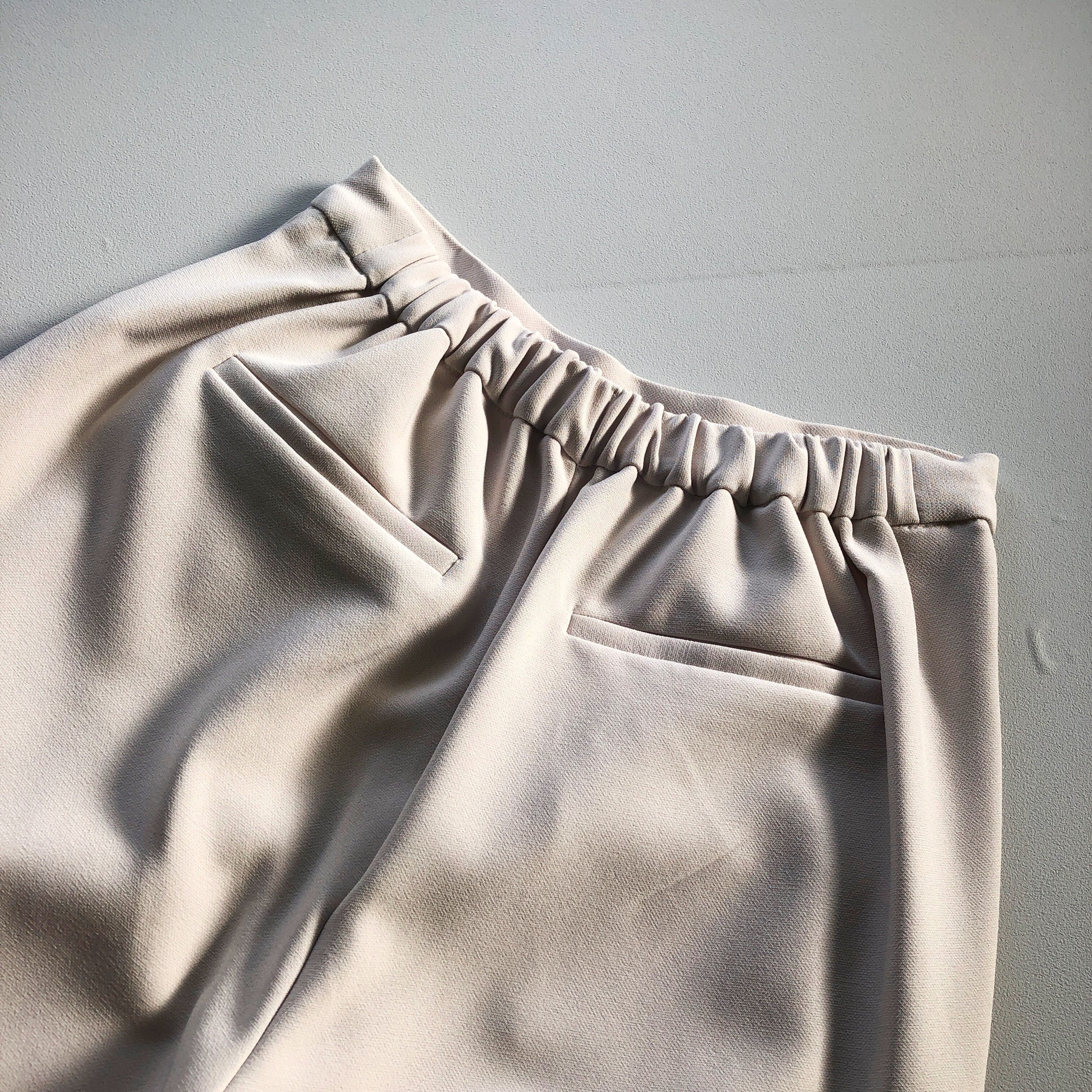 ウエストは後ろのみゴム、脇ポケットあり、後ろのポケットは飾りです。