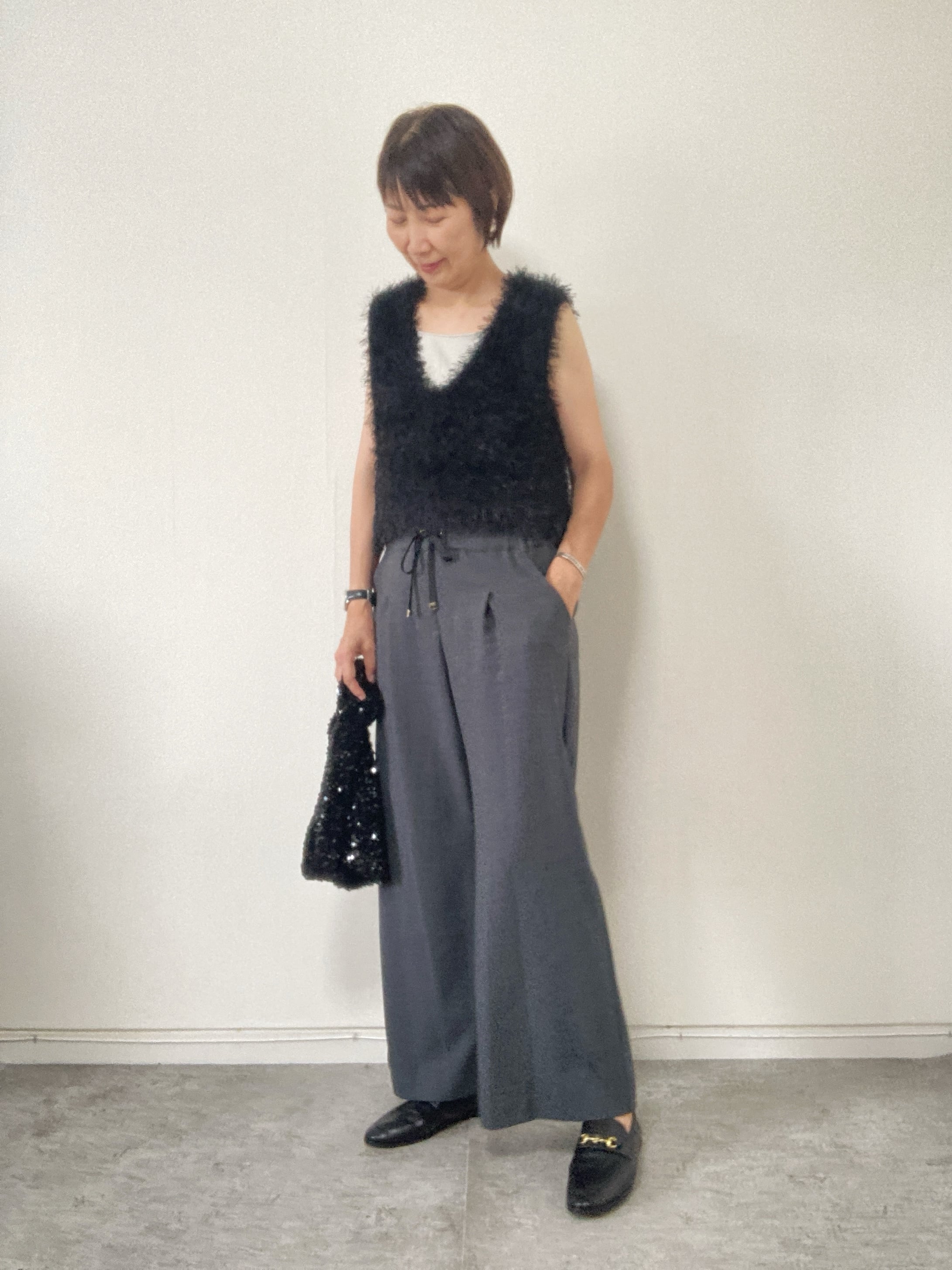 セットアップで着用する時、テーパードパンツはあまり好みでない方にはこちらのワイドパンツをおススメします。