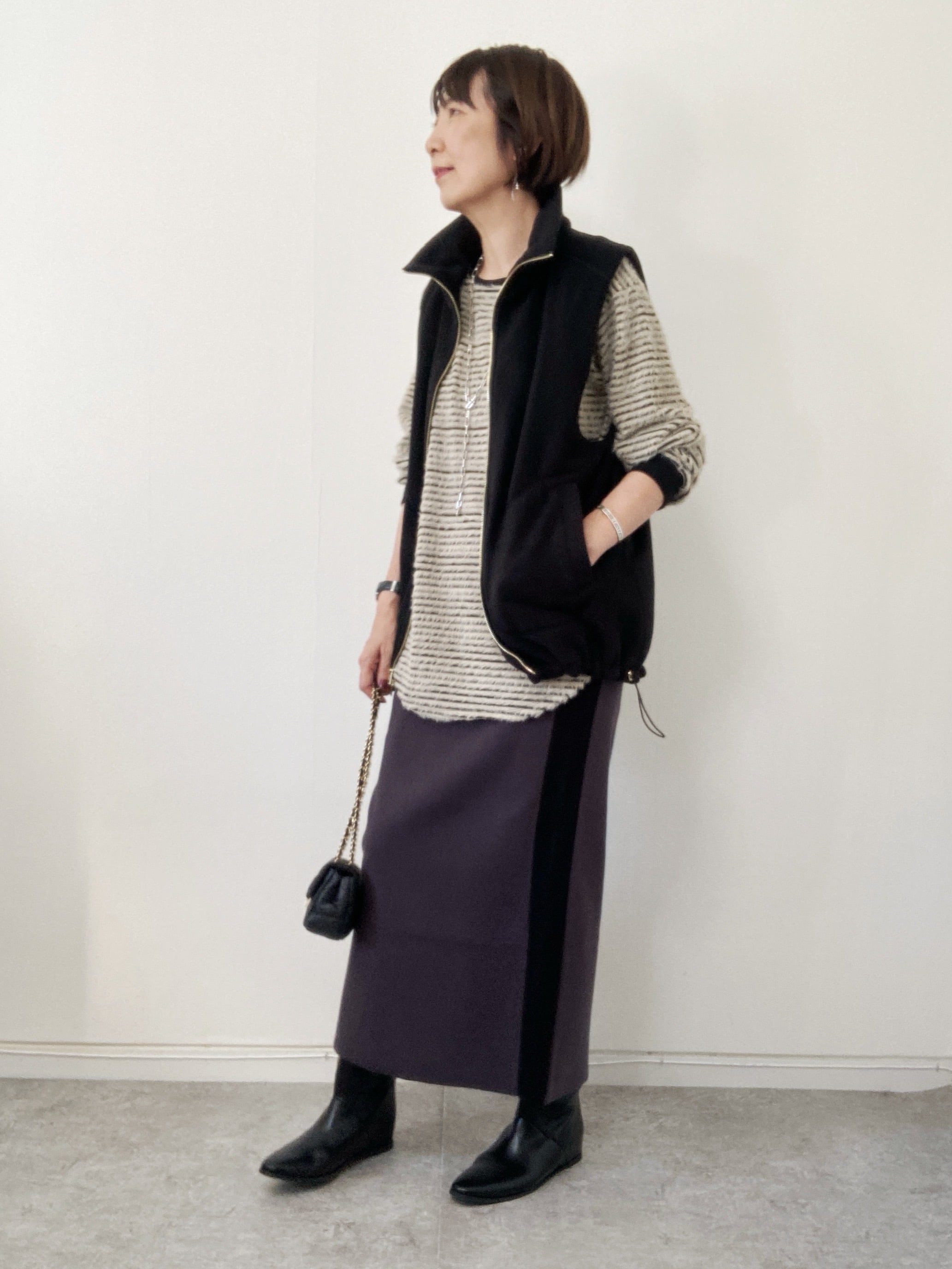 ファスナーが無いデザインですが履き口が広く着脱も簡単で筒周りのシルエットに対して、足首にシェイプが入っているように見え美脚効果があります。